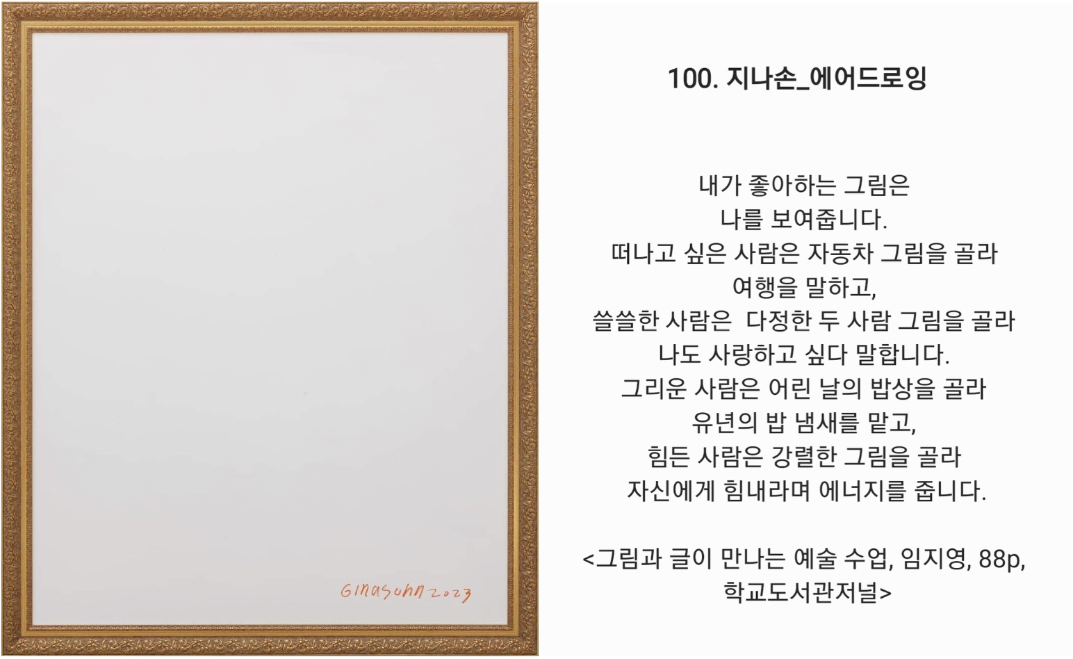100일, 곰이 웅녀가 되는 시간. 사랑에 빠지기 충분한 시간. 예술이 일상이 되는 시간. 작년 10월 1일, 그림과 글이 만나는 향유 필사 100일 과정을 시작했다. 60명 넘게 함께 했고, 마.침.내. 오늘이 100일째다. 매일 새벽 6시 그림 한 점, 글 한 편을 올렸다. 필사를 하거나 단상을 쓰거나, 향유는 자유.