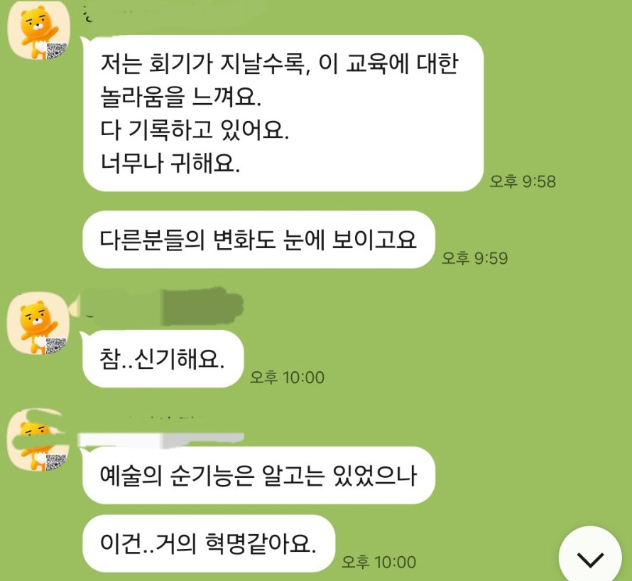 예술 감성 교육이 성장할 수 있었던 것은, 이 과정의 가치를 알고 시간과 마음을 내어주는 분들 덕분입니다. 딱히 광고도 없이 아트코치 과정에 들어오신 선생님들을 보면 와, 매번 감동이죠. 그 반짝이는 눈빛들이 감사해서, 그 배우려는 마음이 뜨거워서, 저도 매시간 정성으로 준비하고 온마음을 다합니다.